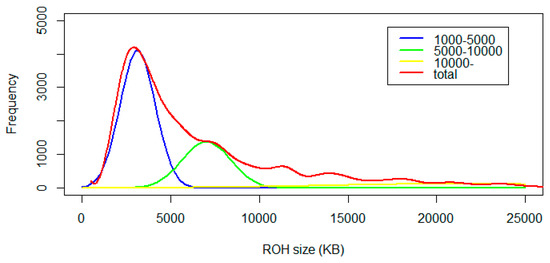 In recent years, the inbreeding coefficient based on ROH has received more attention, and it was considered to be an accurate estimator to control the probability of inbreeding [5,42]. Compared with FROH, another genomic inbreeding estimator FHOM takes all of the homozygote into account, including separate single locus and homozygous regions. In that case, it will confound all of the history events in experimental population. At the same time, it will increase errors and biases caused by homozygotes generated by random recombination. On the contrary, FROH could exclude accidental errors though removing single homozygous and quite short segments. In addition, it has been used in animal genetic analysis [7]. For example, Zhang et al. employed ROH to calculated inbreeding coefficients in cattle population and investigated the distribution of functional variants [11]. Bosse et al. remarked on the impact of demography and recombination on the formation of ROH to master genome inbreeding [10]. Mastrangelo et al. utilized FROH to improve mating systems in Italian sheep breeds [6]. Furthermore, based on several recent researches, the short ROH and intermediate ROH were more potentially result from LD and ancient inbreeding, whereas long ROH could represent the level of recent inbreeding more appropriately by excluding obstacle of LD and random effects [8,43,44]. However, the size of boundary between classes was specific to different populations and breeds. Thus, it is more feasible to use total ROH instead of long ROH to estimate level of inbreeding.