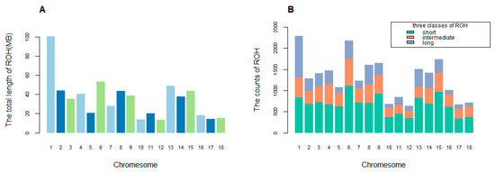 Distribution of ROH in each chromosome. (A) Total length of ROH on 18 autosomes. (B) Counts of three classes of ROH on 18 autosomes.