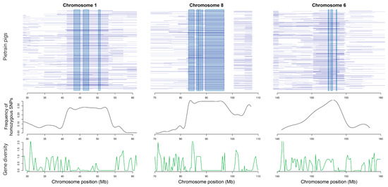 The distribution of ROH core regions in chromosome 1, 8 and 6, the allele frequency and gene diversity in each SNP among the corresponding regions. Blue horizontal lines represent distribution of ROH of per individual. Black line represents frequency of homozygous SNPs averaged in each step of 100Kb. Green line represents gene diversity per SNP.