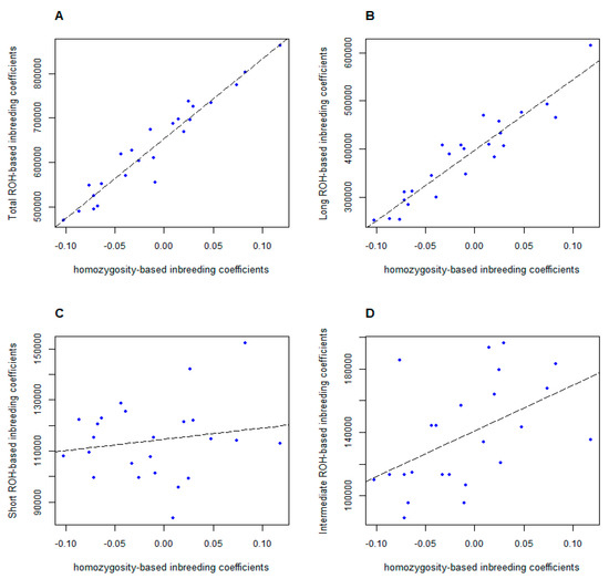 Relationship between ROH-based inbreeding coefficients and homozygosity-based inbreeding coefficients. (A) shows FHOM and FROH (total) had a high correlation (r = 0.949, p-value = 1.908e-06). (B) shows FROH (long ROH) also was strongly correlated with FHOM (r = 0.910, p-value = 2.614e-06). (C) shows FHOM and FROH (short) had a low correlation (r = 0.038, p-value = 0.860). (D) shows FHOM and FROH (intermediate) had a low correlation (r = 0.499, p-value = 0.014).