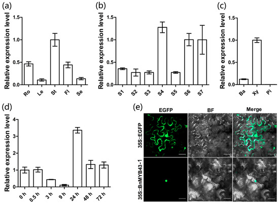 Expression pattern of BnMYB43 gene family in oilseed rape and subcellular localization of BnMYB43-1 in Nicotiana benthamiana. (a) Expression analysis of BnMYB43 gene family in organs of B. napus. (b) Expression analysis of BnMYB43 gene family in stems of B. napus. (c) Expression analysis of BnMYB43 gene family in stem tissues of B. napus. (d) Expression analysis of BnMYB43 gene family after inoculation by S. sclerotiorum. (e) Subcellular localization of BnMYB43-1 in the nucleus. The expression levels were relative to stem (a), S7 (b), Xy (c) and 0 h (d), which were set to 1. Expression level of 25SrRNA was used as a control reference gene. Ro, root; Le, leaf; St, stem; Fl, flower; Se, seed (30 DAP); S1, growth cone tip; S2, main-stem primordium; S3, initially lignified main-stem; S4, semi-lignified main-stem; S5, completely lignified main-stem; S6, semi-mature stem; S7, mature stem; Ba, bark; Xy, xylem; Pi, pith; Bars, 50 μm (e). Values are means ± SD (standard deviation) from three biologically independent repeats.