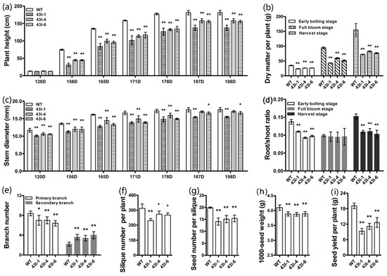 Phenotypic changes of BnMYB43I transgenic plants. (a) The development dynamic of the plant height. (b) The dry matter of plant. (c) The development dynamic of the main stem diameter. (d) The root/shoot radio. (e) Number of branches. (f) Number of silique at the mature stage (191D). (g) Number of seed per silique. (h) The weight of 1000-grain of oilseed rape. (i) The weight of the seed yield per plant. Values are means ± SD from three biologically independent repeats. Asterisks indicate significant or extremely significant differences from the control (*, 0.01 ≤ p < 0.05; **, p < 0.01) using one-way ANOVA.