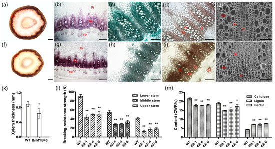 The phenotypes of morphologies, ingredients and properties of the stem in the oilseed rape at mature stage. (a–e) The cross sections of the stem in WT at mature stage. (f–j) The cross sections of the stem in the BnMYB43I lines at mature stage. (a,f) Mäule staining of lignin in whole cross sections. (b,g) Phloroglucinol-HCl staining of lignin in partial cross sections. (c,h) Fast Green FCF staining of cellulose in partial cross sections. (d,i) Hydroxylammonium staining of pectin in partial cross sections. (e,j) The morphologies of vessel and interfascicular fibers. (k) The thickness of xylem. (l) The breaking-resistance strength of stem. (m) Determination of the content of cellulose, lignin and pectin. Lengths of the I-line in (a) and (f) are the lengths of each vascular bundle, and the average of them is the thickness of xylem. Pi, pith; Xy, xylem; Ph, phloem; Ve, vessel; Sc, sclerenchymatous cell; If, interfascicular fibers; ST, sieve tube; Bar, 2 mm (a,j), 500 μm (b,g), 250 μm (c–d, h–i), 100 μm (e,j). Values are means ± SD from nine biologically independent repeats. Asterisks indicate significant or extremely significant differences from the control (*, 0.01 ≤ p < 0.05; **, p < 0.01) using one-way ANOVA.