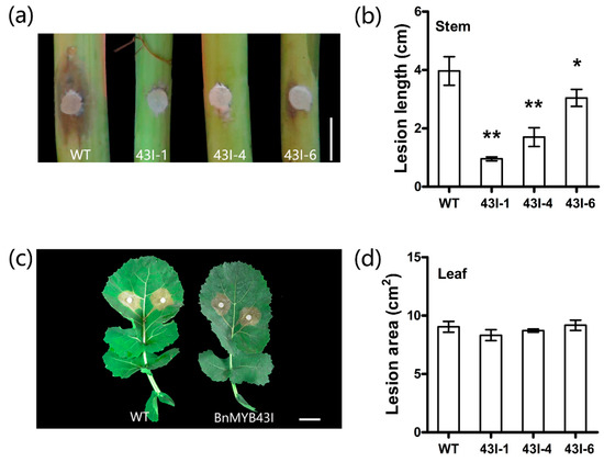 As BnMYB43 expression is responsive to S. sclerotiorum infection as described above (Figure 1d), BnMYB43-silenced plants were identified for S. sclerotiorum resistance. In stem-inoculation identification, lesion length was drastically decreased by 52.10% in the transgenic plants compared to WT, implying a great increase in resistance to S. sclerotiorum stem rot disease (Figure 4a,b). Leaf-inoculation identification results showed a non-significant enhancement in resistance to S. sclerotiorum in transgenic plants (Figure 4c,d). It is clear that the suppression of BnMYB43 greatly but solely enhanced the resistance to S. sclerotiorum in vascular organs in which innate BnMYB43 is dominantly expressed.
