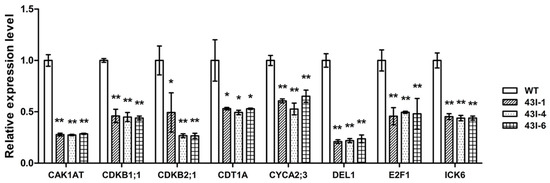 The expression patterns of genes related to cell cycle in the stem of oilseed rape after silencing BnMYB43 gene family. Expression level of each gene in WT was set as 1. Expression level of 25SrRNA was used as control reference. Values are means ± SD (n = 3 biological replicates). Asterisks indicate significant or extremely significant differences from the control (*, 0.01 ≤ p < 0.05; **, p < 0.01) using one-way ANOVA.