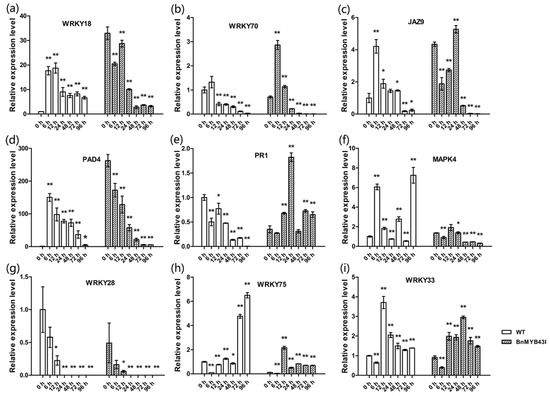In addition, the stems were sampled and analyzed by qRT-PCR at different times after inoculation with S. sclerotiorum. First, there were changes in expression of known genes of SA- or JA-mediated defense pathways. SA-pathway gene WRKY18 was sharply up-regulated by inoculation in WT, but before inoculation its expression in transgenic plants was already up-regulated by 32 folds compared to WT. Though it showed down-regulation in transgenic plants during infection, its expression level was higher than in WT for the first 24 h (Figure 7a). The expression of WRKY70 and JAZ9 in transgenic plants was higher than in WT during the whole infection process, and was highly expressed at the early stage of infection (Figure 7b,c). WRKY70 was associated with both SA- and JA-pathways and was not distinctly influenced by BnMYB43 silencing before inoculation, while JAZ9 was associated with JA-pathway and was distinctly upregulated by BnMYB43 silencing before inoculation. There were some changes in other known defense genes. PAD4 was significantly increased by 262 folds before inoculation in transgenic plants compared with WT plants. In WT, PAD4 expression was sharply up-regulated by 150-fold at 6 h after inoculation. Both transgenic and WT plants showed a down-regulation of PAD4 along the infection process, but the expression was still higher in transgenic plants than in WT (Figure 7d). The expression of PR1 showed an up-regulation trend during infection in transgenic plants but a down-regulation trend in WT plants along the infection process (Figure 7e). There were also expression changes in known genes of S. sclerotiorum resistance or susceptibility. During infection, the expression of MAPK4 was decreased in transgenic plants while increased in WT plants, WRKY28 showed decrease in both transgenic and WT plants, while WRKY75 and WRKY33 showed increase in both transgenic and WT plants (Figure 7f–i). These results showed that the reason for the increased resistance to S. sclerotiorum in BnMYB43I plants was caused by multiple related effects brought by BnMYB43 silencing, and different defensive mechanisms responded differentially to BnMYB43 silencing.