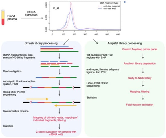 Schematic of NIPT (non-invasive prenatal testing) based on long-chimeric-read sequencing. Extracted cfDNA was divided into two pipelines in parallel: smash (blue) for aneuploidy evaluation and amlifet (green) for cffDNA fraction estimation. For the smash library, cfDNA was additionally fragmented to 40–50 bp fragments, and then was randomly ligated into long chimeric molecules. Whole chimeric reads were mapped to reference genome to identify each fragment’s ends. Fragments were then mapped as individual short reads. For the amplifet library, cfDNA was amplified with a primer pool to simultaneously obtain 100 amplicons with SNPs of interest. The amplicon library was then sequenced. An SNP was considered useful to estimate fetal fraction if maternal genotype was homozygous and fetal genotype was heterozygous. If fetal fraction >4%, aneuploidy statistical test was performed with smash data. * chart from Reference [].