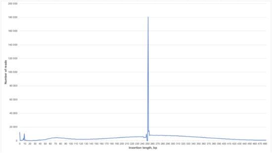 We were able to obtain a larger amount of useful diagnostic information from each read compared to the classic NIPT because of the selected sample preparation conditions and long-read reagents (Rapid Run PE250). The average fragment size in the test samples was 43.8 bp. Thus, the information content of one direct or reverse read with a length of 250 bases was 5.7 times higher than for the classic single read. Since it was impossible to determine the size of the insertion of a pair of reads by mapping them onto the reference genome, in our case we tried to estimate the initial sizes of sequenced chimeric molecules by fusing them using the FLASH tool. FLASH was developed to find the correct overlap between paired-end reads and extend the reads by stitching them together. If the fragments are shorter than twice the read length, the resulting paired-end reads will overlap. The length distribution of chimeric molecules for one of the typical samples is shown in Figure 3. It can be seen that most of the reads had a length of about 250 bp. This means that it was not possible to fuse the pairs of reads, and the length of the chimeric molecule for them exceeded 460 bp, which correlated with the histogram data from the Bioanalyzer (Figure 2A).