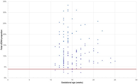 The proportion of fetal DNA (Y axis) versus the gestational age of 139 samples of the control set (X axis), calculated based on the results of amplifet library sequencing. The solid red line indicates a 4% proportion of fetal DNA.