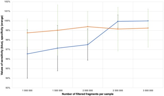 The sensitivity (blue line) and specificity (orange line) values of the determination of aneuploidy on Chromosome 21 with regard to the standard deviation, depending on the number of filtered fragments per sample.