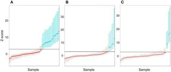 Histograms of Z-score values obtained during the cross-validation of control samples ((A)—T21, (B)—T18, (C)—T13 chromosome). Red indicates samples that did not have the corresponding aneuploidy, green indicates samples with aneuploidy. The maximum and minimum Z values for the sample in the simulations are plotted by error bars. SD values are given in Supplementary Table S4 of Supplementary Files. The black horizontal line in the histograms indicates Z = 3.
