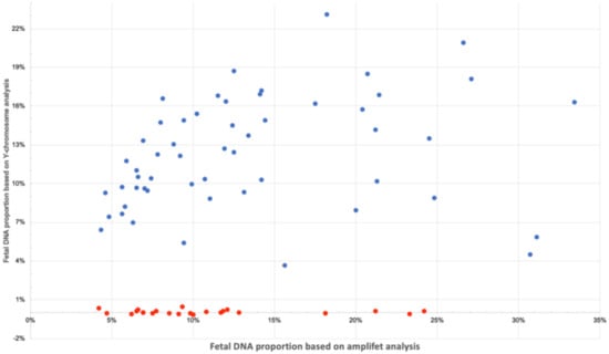 Determination of the sex of the fetus was carried out using calculations of the normalized coverage of the Y chromosome. As can be seen in Figure 7 and in Supplementary Table S5 in Supplementary Files, male and female fetuses were well divided into groups. If the proportion of fetal DNA exceeded 4% and the proportion of the Y chromosome was not higher than 1%, the fetus was female. It can be seen that the results of the determination of the fetal DNA proportion in male samples for amplifet and the Y chromosome tended to correlate. We predict that further adjustments to the Y chromosome calculation system could closely correlate with other methods for determining the proportion of fetal DNA. It is also possible that a similar approach of comparing X chromosomes and autosome coverages could be used to determine the proportion of fetal DNA in mothers pregnant with females.