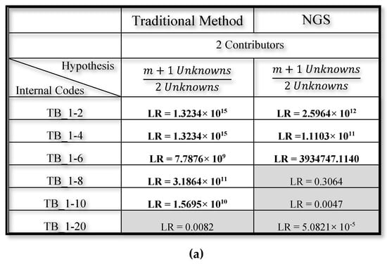 For example, LR calculated for sample TB_1-2 showed the highest values. It is important to underline that LR value, obtained by NGS method, results numerically lower by a factor of 3. Increasing the dilution ratio between the major contributor (M) and the minor contributor (m), the discrepancy of the values through the two methods became more marked. In fact, the TB_1-8 sample showed an LR of 3.1864 × 1011 through traditional methods and an inconclusive LR through NGS method with default parameters (not supporting any hypotheses).