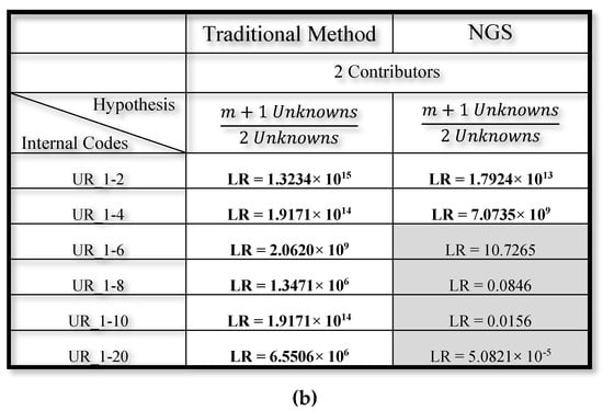 Different results, comparing traditional and NGS methods, were obtained through the semi-continuous approach involving two contributors, in which the inclusion or exclusion of the minor contributor (m) in biological mixtures is evaluated [34].