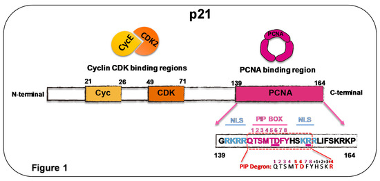 PIP boxes reside in intrinsically disordered regions of proteins. The PIP box consensus sequence was defined as Qxxϕxxψψ, where, by definition, Q is glutamine, x is any amino acid, ϕ is a hydrophobic residue, and ψ an aromatic residue (commonly Phe or Tyr) [27]. The p21 peptide used in the original PCNA crystal structure (139GRKRRQTSMTDFYHSKRRLIFS160) [21] contains p21 PIP box QTSMTDFY (aa 144 to 151) that fulfills all consensus sequence requirements. The PIP box of p21 is actually a PIP degron that targets PCNA-interacting proteins for proteasomal degradation via E3 ubiquitin ligase CRL4Cdt2. PIP degrons are formed by a threonine and an aspartic acid (TD) within the PIP box, and a basic residue (R) in the +4 position from the last residue of the PIP box [28]. A very recent report demonstrated that the outstanding affinity of p21 for PCNA depends not only on such a core, but also on sequences that flank such a region (aa 140 to 143 and aa 152 to 164). Without those sequences, the affinity of p21 for PCNA drops 10 times. Moreover, if such flanking regions are replaced by hydrophilic or negatively charged sequences, affinity is reduced by four orders of magnitude [29]. In conclusion, the whole C terminus of p21, from aa 139 to 164, generates a very strong binding site for p21. It is, therefore, not surprising that p21 binds to the IDCL with much higher affinity than any other known PCNA-interacting protein [30]. Experiments performed in vitro demonstrated that, indeed, p21 is potentially capable of preventing PCNA interaction with replication factors, including DNA polymerase δ, which is in charge of the elongation of the lagging strand [31]. A scheme of the PCNA binding site within the p21 polypeptide is shown in Figure 1. However, it is not yet clear whether p21 levels in cells are sufficient to displace replicative DNA polymerases from active replisomes. It is also difficult to speculate on the consequence of such displacement. While initial parallelism with its effect on CDK activity may suggest that the PCNA-mediated shut-down of DNA replication could be advantageous for cells experiencing DNA damage, at second glance, such a conclusion might be flawed. While CDK inhibition prevents the initiation of DNA replication [32], the interaction of p21 with PCNA at replisomes would block the cell cycle after the initialization of the S phase. In such a scenario, strong reduction in the speed of nascent DNA elongation or its total inhibition would exacerbate the replication stress, a scenario that is not advantageous for the DDR [33,34]. Hence, the role of p21–PCNA interaction in the S phase must not necessarily parallel the model described for CDKs, in which the only effect caused by p21 when interacting with its partners is triggering their inhibition.