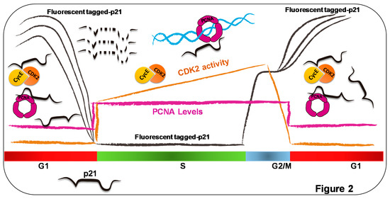 Cell cycle imposes strong regulation on p21 levels in S phase. Levels of fluorescence-tagged p21, PCNA, and CDK activities presented by black, purple, and orange lines, respectively. Endogenous p21 levels not shown, as live image experiments focused on fluorescence-tagged p21. Only in G1 and G2 did p21 levels rise to an extent that could inhibit cyclin–kinase complexes such as CycE/CDK2. Since p21 levels in G1 are very heterogeneous, multiple black lines represent such dispersion in p21 expression. Length of the G1 phase correlates with p21 levels, which were higher than p21 levels in Phase G2 [16]. Whether p21 controls PCNA functions in G1 is still debated, but p21 overexpression levels, which are similar to highest levels reached by endogenous p21 after DNA damage, are not sufficient to modulate replicative DNA synthesis or nucleotide excision repair in G1 [51]. In S phase, levels of fluorescence-tagged p21 were undetectable both in unperturbed conditions and after γ-irradiation, nutlin-3, or neocarzinostatin (NCS) treatment, which are all well-characterized inducers of p21 [16,67,68]. These results indicate that excess of exogenous p21 is strongly prevented in the S phase. Either Cdt2 downregulation or the disruption of the PIP box of p21 allowed p21 upregulation in the S phase, indicating CRL4Cdt2 that degrades PCNA-bound p21, tightly controlling p21 levels in the S phase [16,67]. p21 represented as black linear and unstructured peptide; dotted p21 represent p21 degradation.