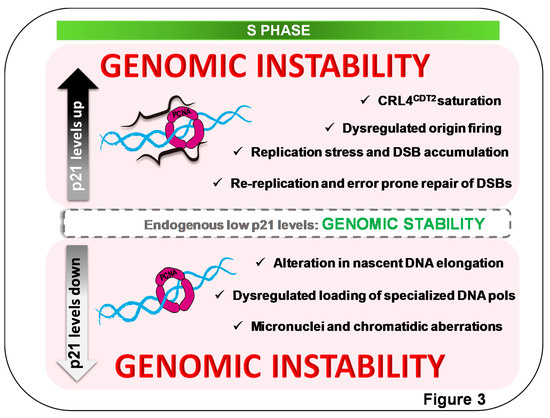 Alterations of endogenous p21 levels in S phase cause genomic instability. Endogenous p21 S normal levels are within the segmented gray box, interacting with PCNA in replication factories [79]. Such p21 levels are required to maintain genomic stability. Both positive and negative changes in p2l levels are detrimental to cell genomic stability. (bottom) Downregulation of p21 levels in S causes alterations in nascent DNA elongation speed in a manner that depends on p21–PCNA interaction [79,82]. Mechanism underlying the promotion of nascent DNA elongation by p21 involves the prevention of dysregulated loading of specialized polymerases to sites of DNA synthesis, favoring the utilization of processive polymerases on undamaged templates. Under such experiment settings, p21 downregulation causes genomic instability in a manner that depends on loss of p21–PCNA interaction [79]. The deaccelerating role of p21, oppositely, also depends on p21–PCNA interaction [82]. (top) While p53-proficient cells do not allow p21 upregulation in the S phase, p53-deficient cells escaping from a senescent-like phenotype allow DNA replication in the context of p21 overexpression. Increased p21 levels in the S phase saturate the CRL4Cdt2 E3 ligase, causing an upregulation of other CRL4Cdt2 targets involved in origin firing [71]. Alterations in replication choreography are followed by rereplication events and double-strand-break (DSB) accumulation that are channeled into error-prone repair, further fueling cell genomic instability [71,75].