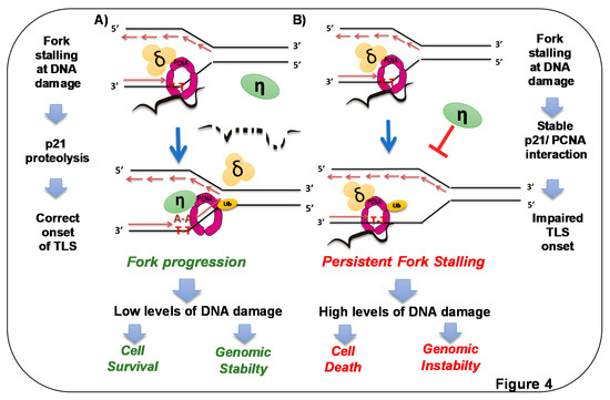 In the previous section, we discussed different reports demonstrating that, regardless of p53-dependent p21 mRNA induction, p21 levels in the S phase are strongly downregulated. Moreover, γ-irradiation cannot trigger p21 accumulation in cells arrested in the S phase using ribonucleotide reductase inhibition by hydroxyurea [73]. Such observations indicate that such a limitation of p21 levels in the S phase could never allow p21-dependent block replicative DNA polymerases. However, recent reports that are discussed below indicated that subtle alterations in the levels of p21 in the S phase affect the replication rate, perhaps by regulating the interaction of PCNA with other partners. Such alterations in replication rate are followed by an increase in the frequency of genome-destabilizing events, unmasking a crucial function of p21–PCNA interaction during the DDR activation in the S phase.