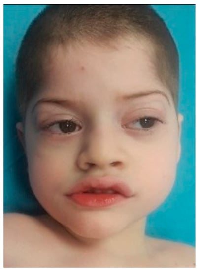 The patient was referred to our Genetics Department of the Emergency County Hospital from Târgu Mureș, Romania, for severe global developmental delay, intellectual disability, sensorineural hearing loss, epilepsy with an onset at the age of four years, under medication, and dysmorphic features. The patient, the third child of a nonconsanguineous marriage, was born from an uncomplicated pregnancy via vaginal delivery, at term and cranial presentation, with a birth weight of 3100 g, length of 52 cm, and an Appearance, Pulse, Grimace, Activity, Respiration (APGAR) score of 9 at the first minute and 10 at five minutes. He also presented a poor weight gain, chronic constipation, severe generalized hypotonia, stereotypic movements of the hands (hand wringing) with repetitive self-injurious behavior (self-biting), and language impairment. The karyotype was performed before and was normal.
