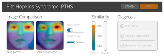 In order to test the utility of the facial analysis technology for PTHS, we used the CLINIC application of the Face2Gene (web interface, version 19.1.3; www.face2gene.com). Face2Gene uses deep-learning algorithms and it has been reported to be a useful technology for some rare diseases, mainly for pediatricians, general practitioners, but also for the young geneticist. The results may be interpreted with caution because more studies are needed to understand the genotype–phenotype correlations [,]. In the case of our patient, based on gestalt comparison, the score was high and suggested the possibility of a patient with PTHS (Figure 3).
