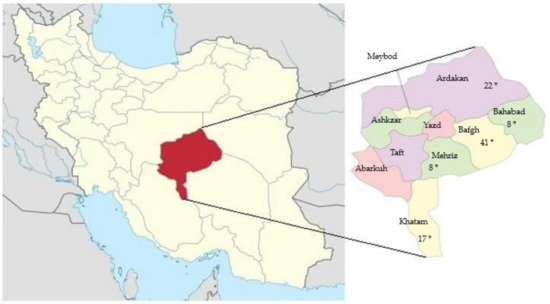 A total of 96 EDTA blood samples of dromedary camels from five regions in Yazd province, Iran, were collected during routine veterinary treatment: (Bafgh (n = 41), Bahabad (n = 8), Khatam (n = 17), Mehriz (n = 8) and Saghand (n = 22)) (Figure 1).