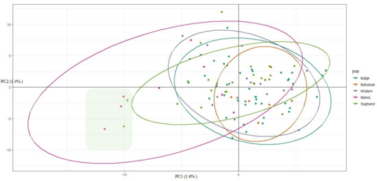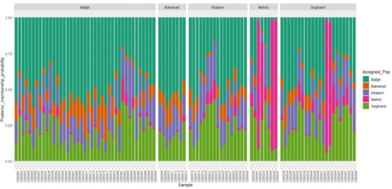 Cluster analysis of the 96 dromedary camels for five regions in the central desert of Iran has been shown in Figure 4. Because of low genetic distance, there were no determined clusters and high admixture among regions (Figure 5). Only 1.6% and 1.4% of the genetic variance was illustrated with PC1 and PC2, respectively, which demonstrated that individuals are relatively homogeneous. Nonetheless, five samples that originate from outside of Iran (Pakistan: GBS046, GBS047, GBS042, GBS057, and GBS058) diverged from the rest (Figure 4 and Figure 5). The pairwise FST statistic among five populations of Iran’s central desert camels was very low (0.002–0.011) (Table 3).