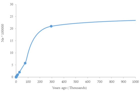 Recent Ne (up to 10 generations ago) was estimated as 89 to 487, respectively (Table 4). The trend of Ne shows a great decrease of up to 90% until the last glacial period (LGP; 100,000–20,000 years ago and another bottleneck around 2000–6000 years ago (Figure 7)).