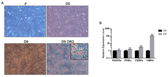 Figure 1. Adipogenic differentiation of bovine fetal skeletal muscle-derived PDGFRα⁺ cells. (A) Shown are proliferating PDGFRα+ cells (P) on Day 0 (D0) and Day 9 (D9) following adipogenic differentiation. Differentiated cells on Day 9 were stained with Oil Red O (D9 ORO). Scale bar = 100 μm, inset scale bar = 50 μm. (B) Relative gene expression of adipocyte-specific genes on Day 0 (D0) and Day 9 (D9). All the measurements shown are the means ± SEM of four biological replicates from independent cell experiments. * p < 0.05; ** p < 0.01.