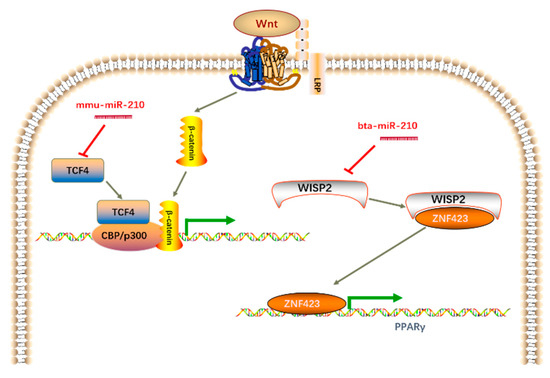 Figure 7. Distinct mechanism of miR-210 in the regulation of mouse and cattle adipogenesis. The canonical Wnt signaling pathway is presented in the figure. Arrows indicate positive regulation, and bars indicate negative regulation.