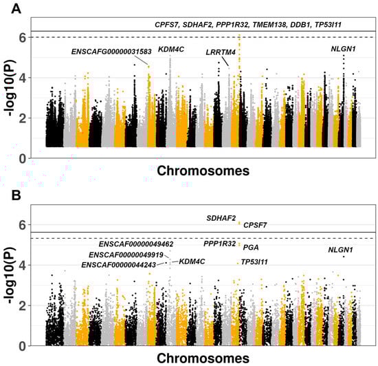 The GWAS was conducted using a mixed linear model (MLM) to account for relatedness and population structure, as implemented in the GEMMA v0.96 software, assessing the significance with the Wald test. The first step of the analysis included the estimation of the relatedness matrix, and the top 10 principal components. These metrics were included in the second step (GWAS), allowing for the adjustment for both relatedness and population structure. Results were corrected at the genome-wide level using the Bonferroni method, accounting for the number of independent SNPs tested according the linkage disequilibrium (LD) patterns estimated using the option --indep-pairwise 10,000 1 0.80 in PLINK v1.9. Using this approach, we found 101,740 independent SNPs. Variants were annotated according CanFam3.1 assembly using the R-package Biomart v2.42.0 [28]. Lambda inflation factor (λ) and quantile-quantile plots (qqplots) were computed using the R-package snpStats.