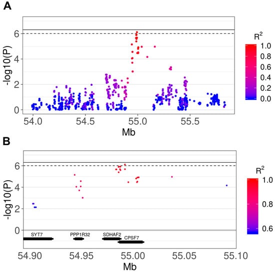 We obtained λ = 1.052, demonstrating an absence of significant population stratification after principal components adjustment (Figure S3). We did not detect any genome-wide significant variant after multiple testing correction, but one variant (rs22669389) was identified at a suggestive level of significance (adj p = 0.078). All of the top SNPs reported in Table 1 are located in the same region on chromosome 18 between 54,983,627 and 54,992,285 (8658 bp), encompassing the two overlapping genes succinate dehydrogenase complex assembly factor 2 (SDHAF2) and cleavage and polyadenylation specific factor 7 (CPSF7), and being located upstream, in introns or in 5’ untranslated regions (UTR) of the two genes. In addition to the SNP-level-analysis, we computed a multi-marker test using the GATES method, adjusting the results for the total number of genes tested (n = 18,110; p < 2.76 × 10−6). SNPs were assigned to a gene when ± 1500 bp from the gene was found. The results showed two significant genes after Bonferroni correction: CPSF7 (adj p = 0.016) and SDHAF2 (adj p = 0.024). The corresponding Manhattan plot is shown in Figure 1B. The results of the GATES analysis were confirmed when we considered larger distances for the SNP to gene assignments (for both ± 5000 bp and ± 10,000 bp). The regional plot including all of the SNPs in the region is shown in Figure 2, also reporting the LD patterns as R2 values. Figure 2A shows a region of 2 Mb around the top SNP (rs22669389), with the R2 ranging from 0 (absence of LD) to 1 (complete LD). Figure 2B shows a smaller region around the top SNP (0.2 Mb), showing the R2 ranging from 0.56 to 1.