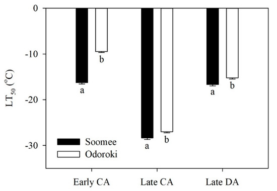 - Lee, J.H.; Yu, D.J.; Kim, S.J.; Choi, D.; Lee, H.J. Intraspecies differences in cold hardiness, carbohydrate content, and β-amylase gene expression of Vaccinium corymbosum during cold acclimation and deacclimation. Tree Physiol. 2012, 32, 1533–1540. [Google Scholar] [CrossRef] [PubMed]