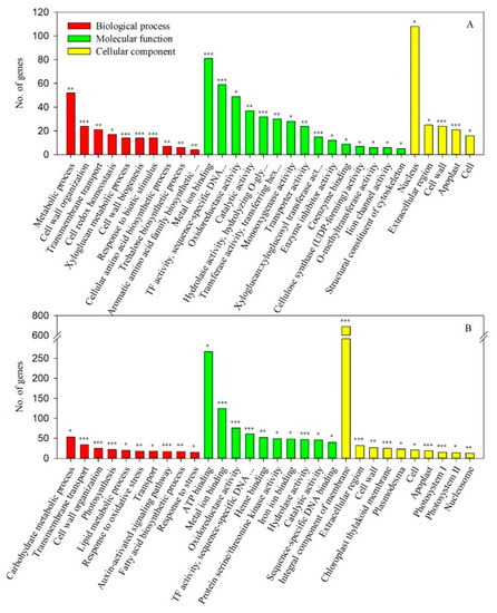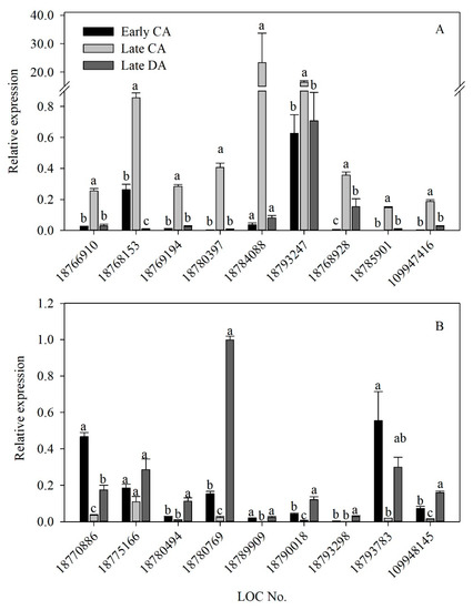 3.5. Functional Annotation and GO Term Enrichment of the DEGs during DA, from Late CA to Late DA