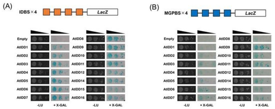 Analysis of the DNA binding ability of Arabidopsis INDETERMINATE DOMAIN (AtIDD) proteins using yeast one-hybrid assay. A tandem sequence of four copies of IDD binding sequence (IDDBS) (A) and MGP binding sequence (MGPBS) (B) were placed upstream of the LacZ gene and used as promoters. DNA binding was detected by X-gal staining assay. Empty, empty vector pGAD424.
