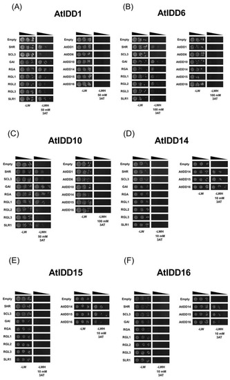 In contrast to AtIDD1, 6, 10, and OsID1, group A AtIDD proteins (AtIDD14, 15, and 16) did not show interaction with all DELLA proteins, SHR, and SCL3. Instead, they interacted with other group A proteins or with themselves (Figure 3D–F). These results agree with those of a previous study [14,36].
