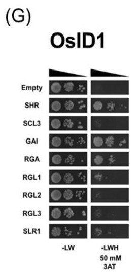 IDD proteins have been reported to interact with RGA and GAI through their C-terminal region that contains two conserved sequences: the MSATALLQKAA motif and the TR/LDFLG motif. Among AtIDDs, AtIDD6 lacks the MSATALLQKAA motif, and 14, 15, and 16 lack both the conserved motifs [3]. Fukazawa et al. reported that the PAM sequence in AtIDD2, which corresponds to the MSATALLQKAA motif, is required for interaction with GAI [9]. Although AtIDD6 lacks the PAM sequence, AtIDD6 interacts with DELLA proteins, including GAI. Therefore, we examined the interaction between GRAS proteins and another IDD proteins lacking the PAM sequence, OsID1 [3]. OsID1 interacted with SHR, GAI, RGA, and RGL1 and showed weak interaction with RGL2, RGL3, and SLR1 (Figure 2G).