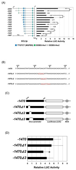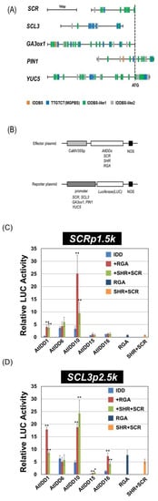 First, we analyzed the location of IDDBS, MGPBS, and other candidates of the IDD binding sequence. Because our previous study showed that AtIDD3 and AtIDD10 bind to the sequence containing GTC(G/C) [38], we searched for sequence GTC(G/C) in each promoter (Figure 3A and Figure S1). When the 11 bp sequence containing GTC(G/C) is less than 6 bp identical to IDDBS, the possibility of the sequences bound by IDD proteins may be very low. Therefore, we defined these sequences as IDDBS-like2 in Figure 3A. Other sequences containing GTC(G/C) were defined as IDDBS-like1. Among the DNA binding sequences in Figure 3A, MGPBS and IDDBS-like1 in the SCR promoter and MGPBS at the 3′ site of the SCL3 promoter were experimentally shown to be bound by IDD proteins in the previous study [8,38]. There are several candidates for IDD binding in these promoters although the binding of IDD proteins to these candidate sequences has not been confirmed. These promoter sequences were ligated upstream of the luciferase (LUC) gene to construct reporter vectors for the transient assay (Figure 3B).
