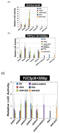 When the GA3ox1 promoter was used as a reporter, the results were similar to that with the SCR promoter (Figure 3E). Unlike in the result with the SCR promoter, the activity of AtIDD10 with SHR + SCR was much higher than that with RGA.
