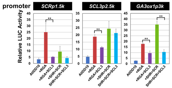 The effect of SCL3 on the activity of AtIDD10 + RGA or AtIDD10 + SHR + SCR on several promoters. The promoters of SCR, SCL3, and GA3ox1 were used as reporters. As a control, an empty vector was used, and all LUC activities were expressed relative to this control (value set at 1). Values shown are the average of results from three or four independent experiments. Error bars represent the SD. Asterisks indicate significant differences in activity in the presence or absence of SCL3 (** p < 0.01).