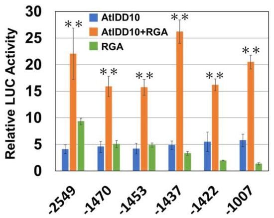 Activation of the deletion series of the SCL3 promoter by the AtIDD10 + RGA complex. Values shown are the average of results from three or four independent experiments. Error bars represent the SD. Asterisks indicate significant differences between the presence or absence of RGA (** p < 0.01).