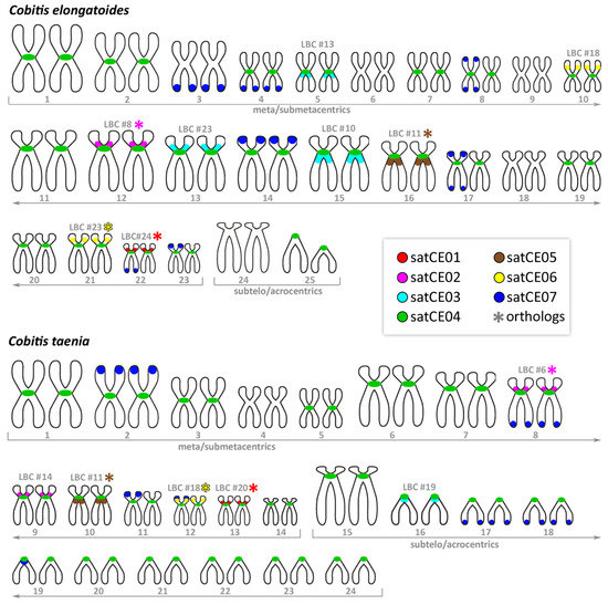 Representative ideograms. Schematic representations of karyotypes of C. elongatoides and C. taenia showing the distribution of the satDNA markers satCE01–satCE07. An asterisk indicates possible orthologous chromosome pairs between species. The numbers above chromosome pairs indicate respective assignment to lampbrush chromosomes (LBC) based on lampbrush chromosome maps (Supplementary Figure S3). SatCE07 signals are presented on one of the homologs probably due to the absence of equal distribution of this satDNA on homologous chromosomes. Alternatively, it could be that the satCE07 signal on another homologous chromosome is under the discrimination resolution of the FISH method.