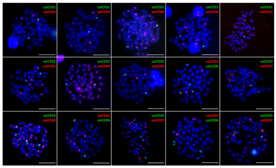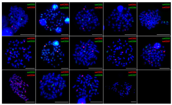 Mapping of satDNA markers on chromosomes of C. taenia. Representative metaphases after double-colored FISH showing the position of satellites satCE01–satCE07 on chromosomes. SatCE02, satCE03, satCE06, and satCE07 show an interspecific polymorphism in the number of detected signals in C. taenia. Bars equal 10 µM.