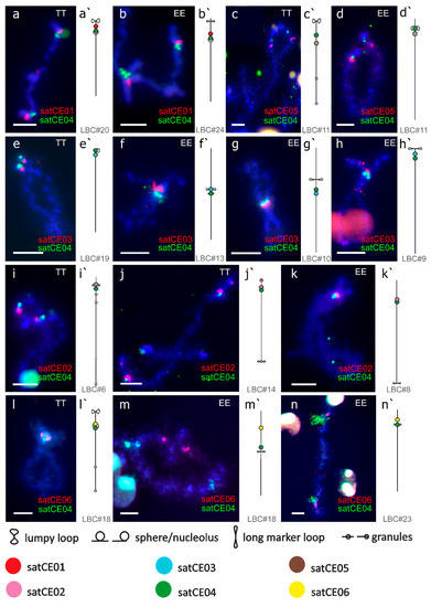 Analyses of lampbrush chromosomes of C. elongatoides and C. taenia. High-resolution mapping of selected markers on lampbrush chromosomes forming bivalents during diplotene phase of meiotic division and corresponded lampbrush chromosomal maps. satCE04 marker (green) indicates centromere position on all presented lampbrush chromosomes of C. elongatoides (EE) and, C. taenia (TT). satCE01 repeat (red) was localized on lampbrush chromosomes no. 24 in C. elongatoides (a,a’) and no. 20 (b,b’) in C. taenia. satCE05 repeat (red) was mapped on lampbrush chromosome no. 11 in both C. elongatoides (c,c’) and C. taenia (d,d’). satCE03 repeat was localized on lampbrush chromosome no. 19 (e,e’) in C. taenia and on 3 lampbrush chromosomes in C. elongatoides: no. 9 (f,f’), no. 10 (g,g’), and no. 13 (h,h’). satCE02 marker located on lampbrush chromosomes no.6 (i,i’) and no. 14 (j,j’) in C. taenia and lampbrush chromosome no. 8 (k,k’) in C. elongatoides. satCE06 marker was mapped on lampbrush chromosome no.18 (l,l’) in C. taenia and lampbrush chromosomes no. 18 (m,m’) and no. 23 (n,n’) in C. elongatoides Bar equals 5 µM.
