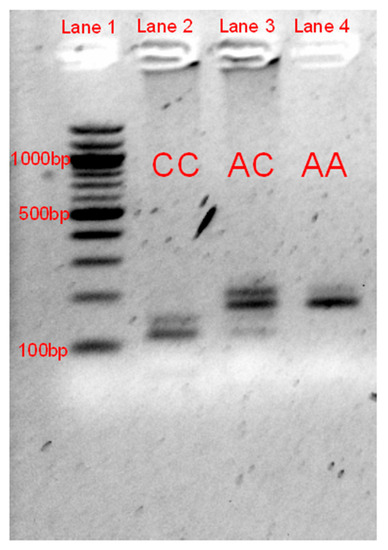Gel image of the RFLP gel electrophoresis validation of the NC_019458.2:g.3451931C>A mutation. Lane 1 represents the 100-bp reference ladder, with the 1000, 500, and 100 bp bands labeled. Lanes 2 through 4 represent the three genotypes at this variant. The normal allele (C) results in four expected fragments of 121, 57, 38, and 29 bp while the dilute allele (A) results in only three expected fragments of 178, 38, and 29 bp. The 178- and 121-bp fragments were the primary ones used for genotyping, as the smaller bands were more difficult to identify. The bands of approximately 150 bp and 200 bp are likely to be the result of an incomplete digestion of the last EarI recognition site within the PCR product.