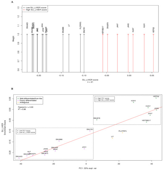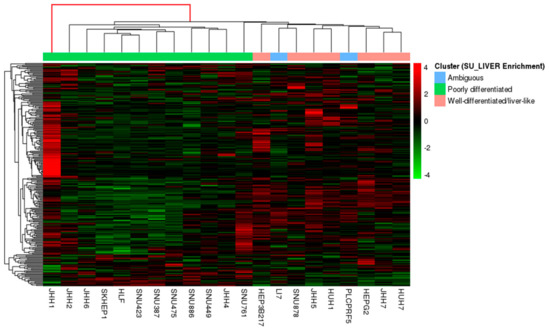 Results for only two cell lines, namely LI7 and PLCPRF5, were conflicting, because their PC1 score clustering opposed their SU_LIVER enrichment score clustering; therefore, these cell lines were characterized as ambiguous.