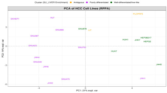 Finally, PCA based on protein/phosphoprotein RPPA expression data showed that the clustering of HCC lines was widely consistent, not only at the gene but also at the protein expression level (Figure 4) and further confirmed the discrete/ambiguous nature of the JHH1 cell line. Based on these findings, JHH1 along with LI7 and PLCPRF5 were considered to be ambiguously characterized in the context of this study and were therefore excluded from downstream analyses, in order to get a more straightforward and comprehensive grasp of distinct differentiation-associated molecular characteristics amongst the remaining HCC lines.