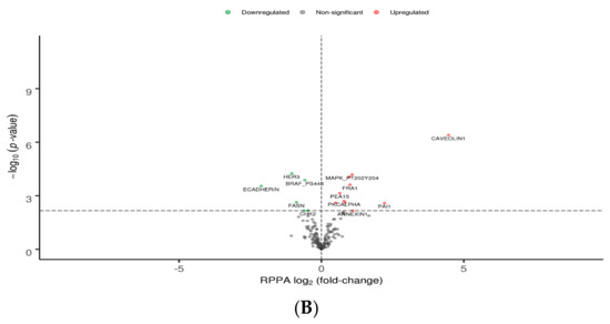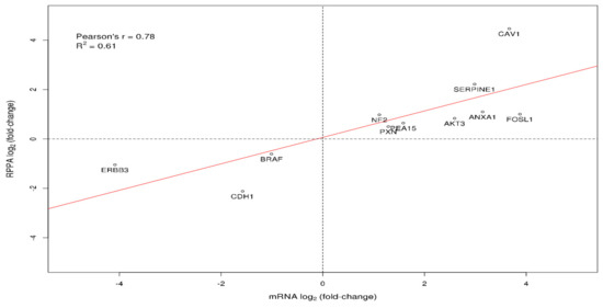 Identified DEPs included downregulated proteins ECADHERIN, HER3, FASN, BRAF, CHK2, and phospho-BRAF, along with upregulated proteins CAVEOLIN1, PAI1, PAXILLIN, PEA15, PKCALPHA, AKT, NF2, FRA1, ANNEXIN1, and phospho-MAPK1/MAPK3. Pairwise total protein–mRNA relationships were investigated, excluding only for this analysis the two phosphorylated DEPs (MAPK_PT202Y204 and BRAF_PS445). For the majority of observed DEPs (HER3, ECADHERIN, BRAF, NF2, PAXILLIN, AKT, ANNEXIN1, PEA15, PAI1, FRA1, CAVEOLIN1) corresponding genes (ERBB3, CDH1, BRAF, NF2, PXN, AKT3, ANXA1, PEA15, SERPINE1, FOSL1, CAV1) were also found to be differentially expressed. A noteworthy observation was made concerning AKT: out of the three genes encoding for the corresponding isoforms—namely AKT1, AKT2, and AKT3 (all detected by a single antibody in applied RPPA procedures [8])—only the expression of AKT3 was significantly upregulated. Furthermore, mRNA expression fold-changes positively correlated with the respective total protein expression changes (Figure 6, Pearson’s r = 0.78, R2 = 0.61, p-value = 0.00458). The genes encoding the remaining DEPs (FASN, CHK2, and PKCALPHA) were either not identified as DEGs based on the predefined criteria, or were not included in the starting list of available genes.