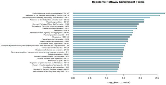 Significantly enriched Reactome Pathway terms ranked by their hypergeometric corrected p-value in negative log10 scale (x-axis). Gene enrichment is also presented in total gene numbers, right after each Reactome Pathway term.