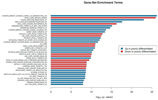 Additional gene-set enrichment analysis using the R function camera [28] provided further complementary information about the differentiation-associated characteristics beyond the obtained GO and Reactome Pathway results, based on the differential expression analysis data between the two identified groups of HCC lines and against curated (C2) gene-sets from MSigDB. Complete gene-set enrichment results are provided in Table S7, and included an important number of statistically significant enriched gene-sets, along with the projected enrichment direction in each set (genes either up- or downregulated in poorly differentiated cell lines). Poorly differentiated HCC lines were characterized by downregulation of gene expression associated with epithelial liver-like traits (HSIAO_LIVER_SPECIFIC_GENES, SU_LIVER) [30,31] and various metabolic processes. In contrast, these HCC lines significantly overexpressed genes associated with Slug-related EMT initiation (ANASTASSIOU_CANCER_MESENCHYMAL_TRANSITION_SIGNATURE) [32], along with hypoxia (ELVIDGE_HYPOXIA_UP) [33] and migration (WU_CELL_MIGRATION) [34]. In addition, camera results unveiled a connection amongst HCC line subtypes and the three distinct molecular subclasses identified by Hoshida et al. [35] in HCC tissues (Subclasses S1, S2 and S3). The top 35 statistically significant gene-sets, ranked by their p-value, are illustrated in Figure 9.