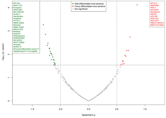 Drug-sensitivity AUC measurements available for 15 of the HCC lines (Table 1, blue font) were correlated with their enrichment scores for a specific/selected (SU_LIVER) gene-set, in an attempt to elucidate differentiation-status-associated drug-sensitivity. Lower AUC sensitivity measurements corresponded to an enhanced drug effect against cell line viability. Liver-like well-differentiated cell lines were characterized by higher enrichment scores than the poorly differentiated ones; therefore, positive correlations highlighted drugs more effective against poorly differentiated cell lines, while negative correlations drugs more effective against well-differentiated ones. Drugs with a p-value < 0.05, an adjusted p-value < 0.3 (after Benjamini–Hochberg correction), and |Spearman’s ρ| > 0.5 were considered to be significantly correlated with the investigated enrichment score.